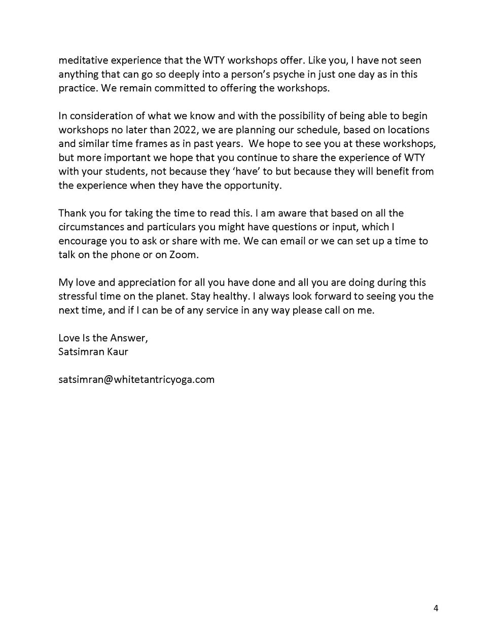 A letter from Satsimran Kaur (White Tantric Yoga CEO)
